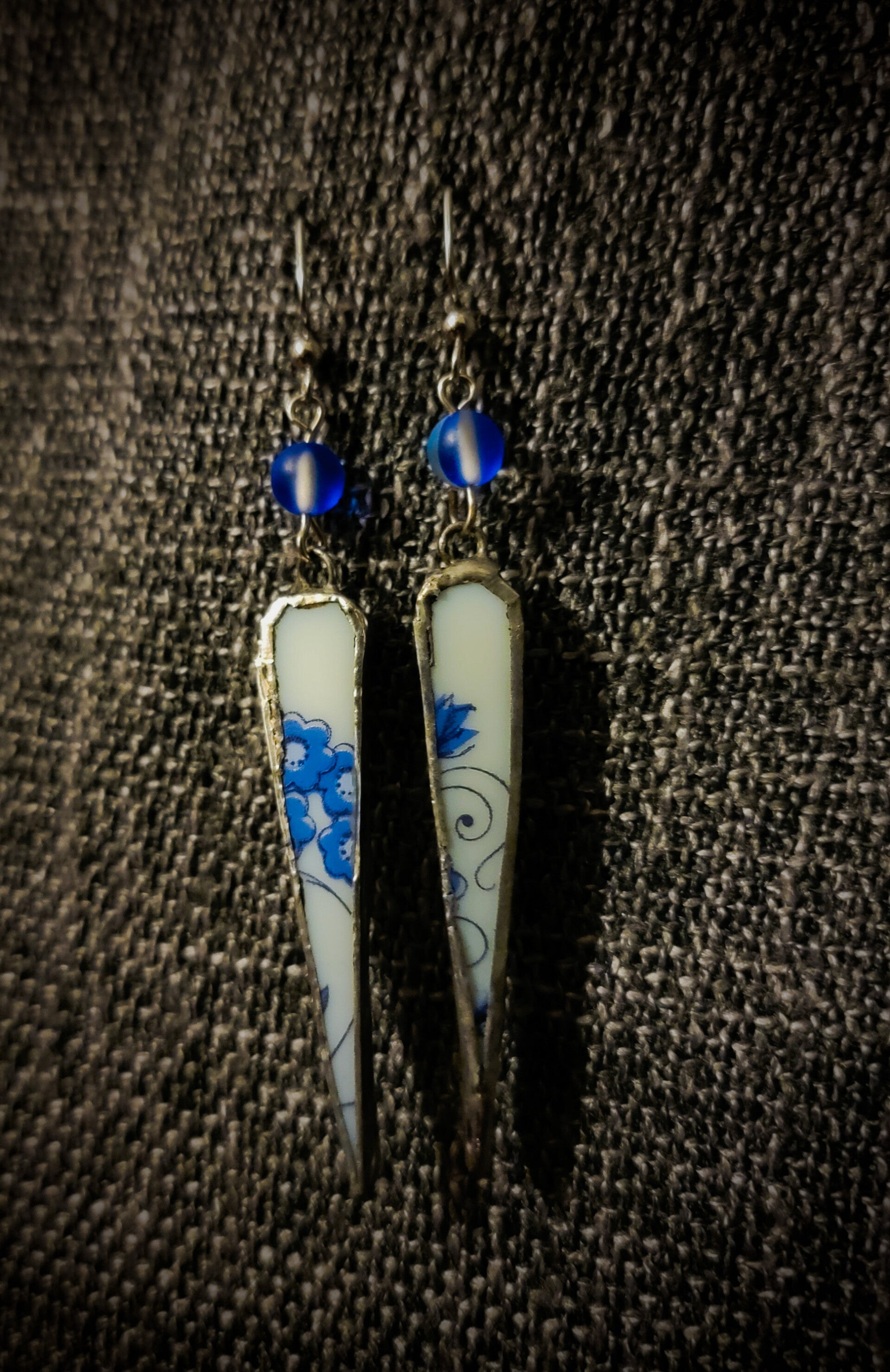 milk glass teardrop earrings adorned with blue glass beads. hang about 2 1/4 inches. go check out the heart pendant. "its a match!"